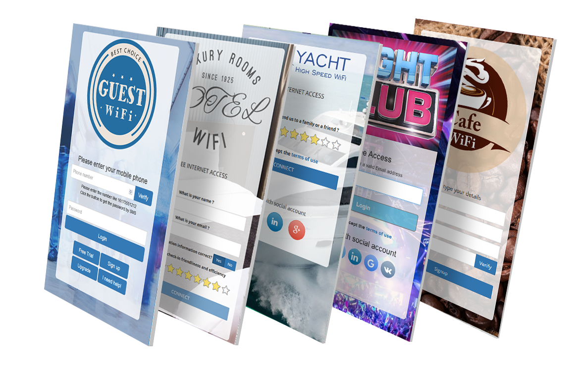Build a free WiFi with social login, shared keyword, SMS or Email verification, or data collection. Limit free access time, bandwidth, daytime, daily & monthly logins, expiration and interval between repeated sessions.